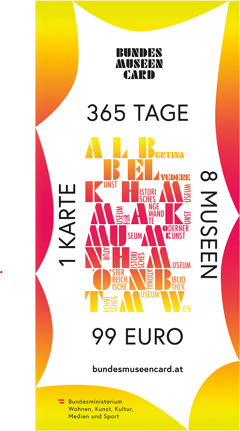 With the Bundesmuseen Card, you have unlimited access for one year to the exhibition program of the Austrian Federal Museums and the museums of the Austrian National Library during regular opening hours—a total of 25 locations.