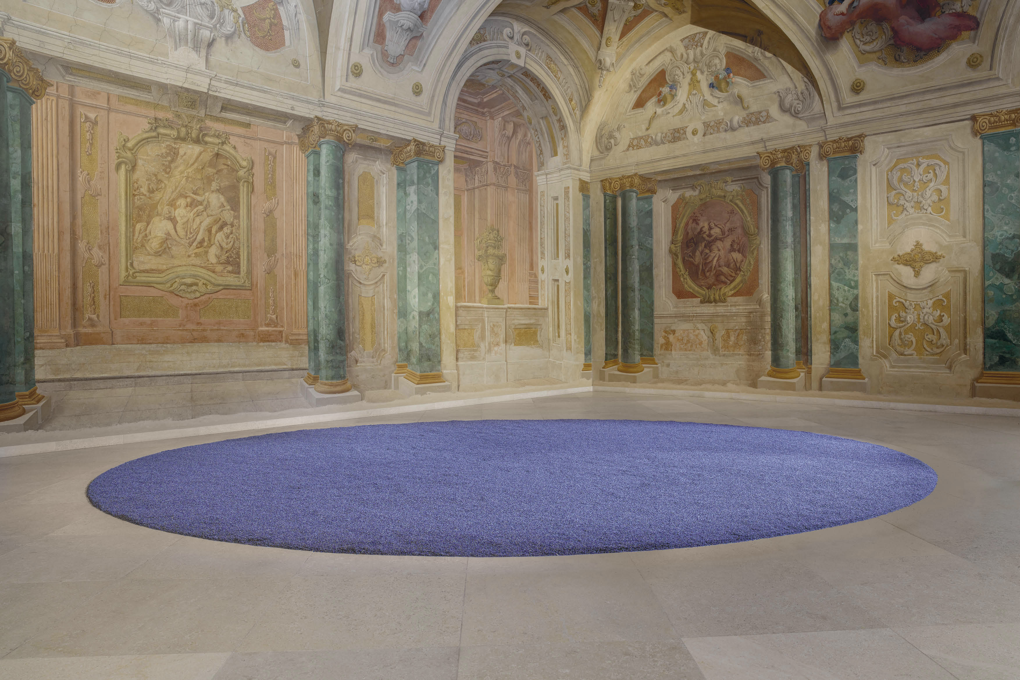 At the heart of herman de vries’s work is a direct encounter with nature, always guided by a deep understanding of and respect for the earth’s natural resources. On daily explorations—for example in the Steigerwald forest in Germany and on his travels—he collects all manner of objects: flowers, stones, sticks, earth, bones, grasses, minerals, and more. He then groups these objets trouvés into sensory installations with a simplicity that has its own intrinsic aesthetic power. 108 pounds of lavender flowers from 1991 is a compelling example of this approach: The elliptical formation of dried flowers spread across the floor fills the space with color and scent. It creates a direct connection between the Baroque world of images and the experience of nature beneath the ceiling fresco of the Carlone Hall.