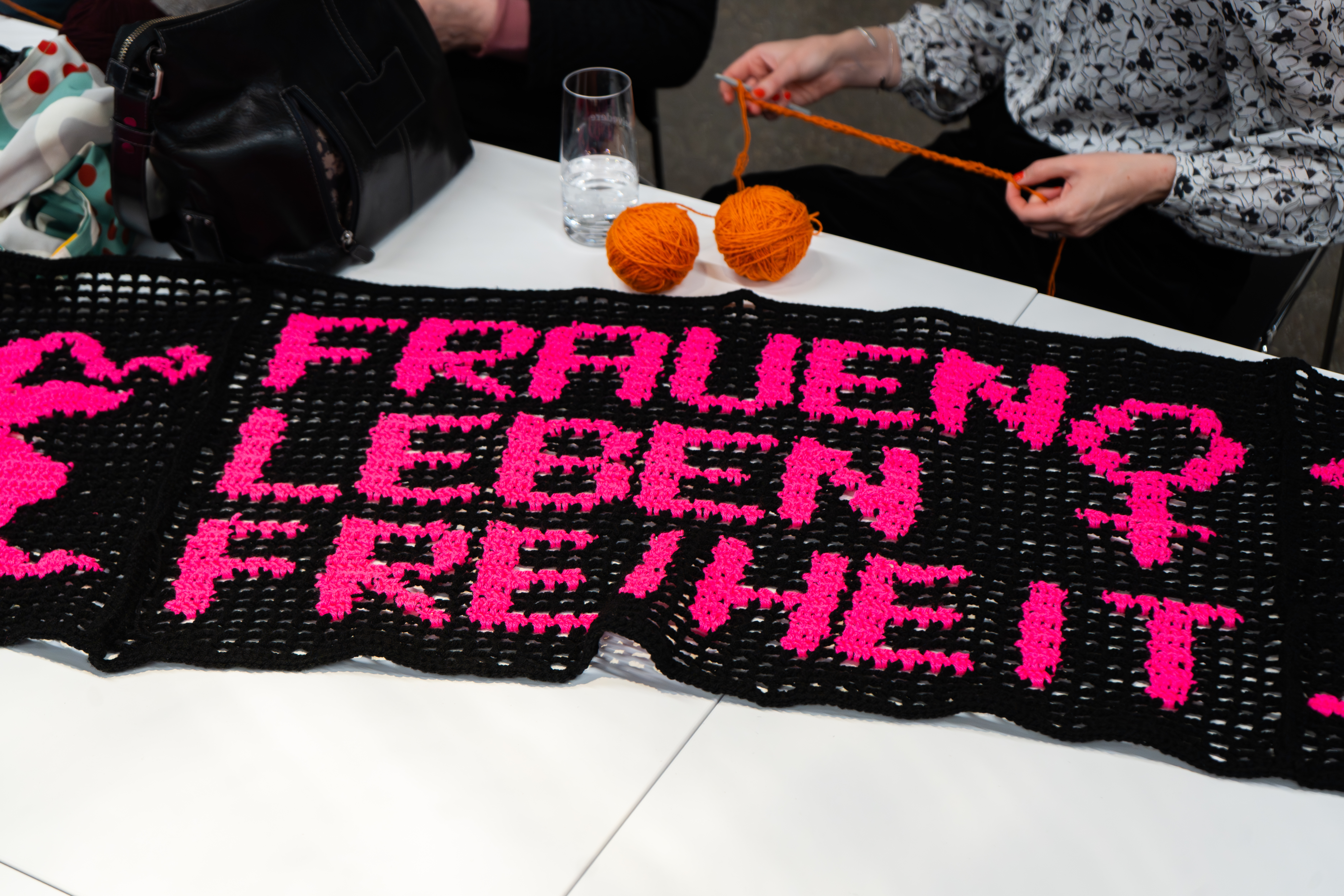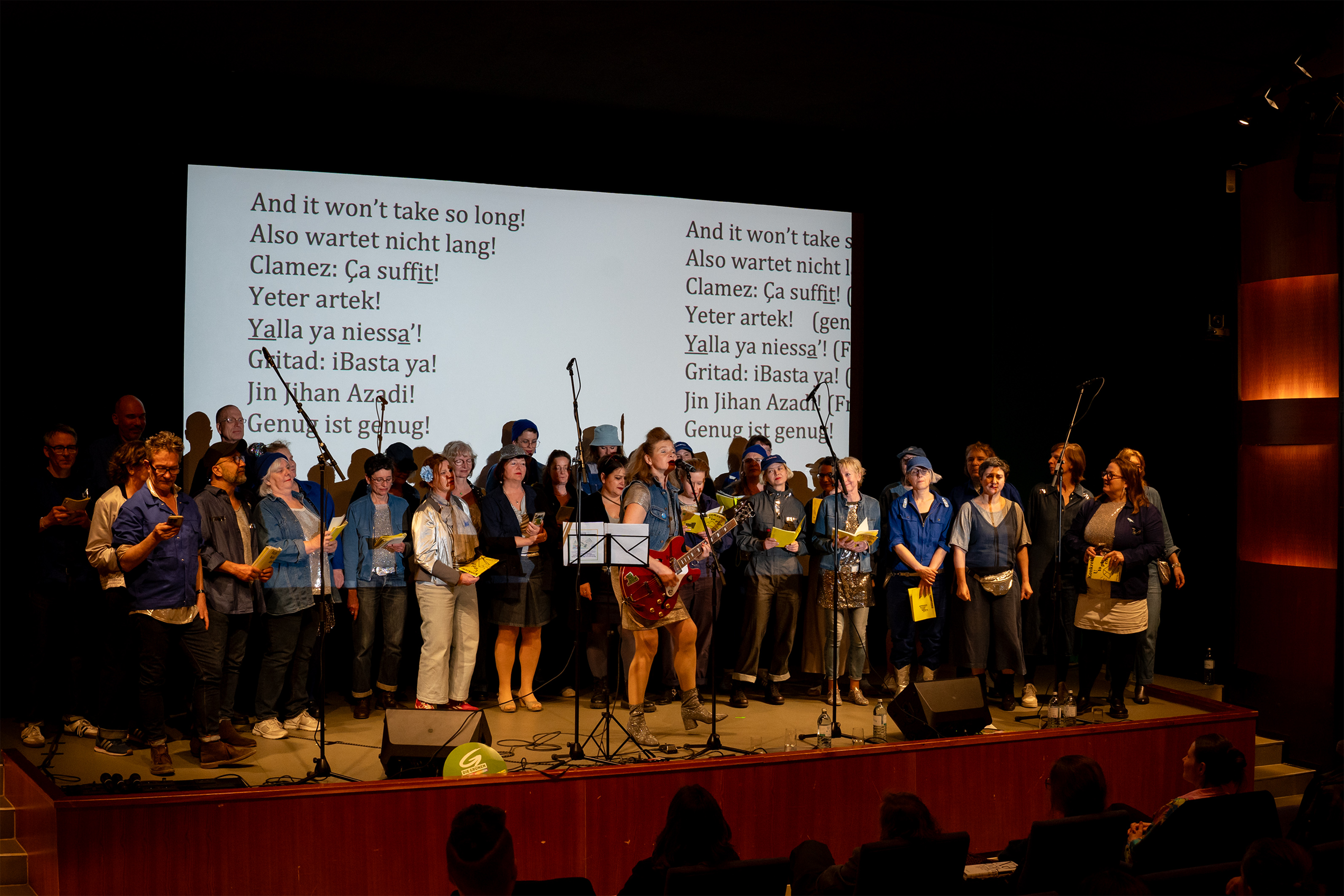 Visitors can explore the exhibitions by Sandra Mujinga, Sue Williams, and Friedl Kubelka / vom Gröller with free admission. Guided tours in German and English offer insights into the building’s and the surrounding area’s eventful history. For all singing enthusiasts, the open rehearsal of the Chors der schönen Aussichten choir offers the chance to raise one’s own voice. This will be followed by a performance by Bernadette La Hengst with the choir. Dean Vuletic will shed light on the political dimension of the Eurovision Song Contest and its significance for the queer community. MC Denice Bourbon will host the evening and provide commentary on the semifinals.