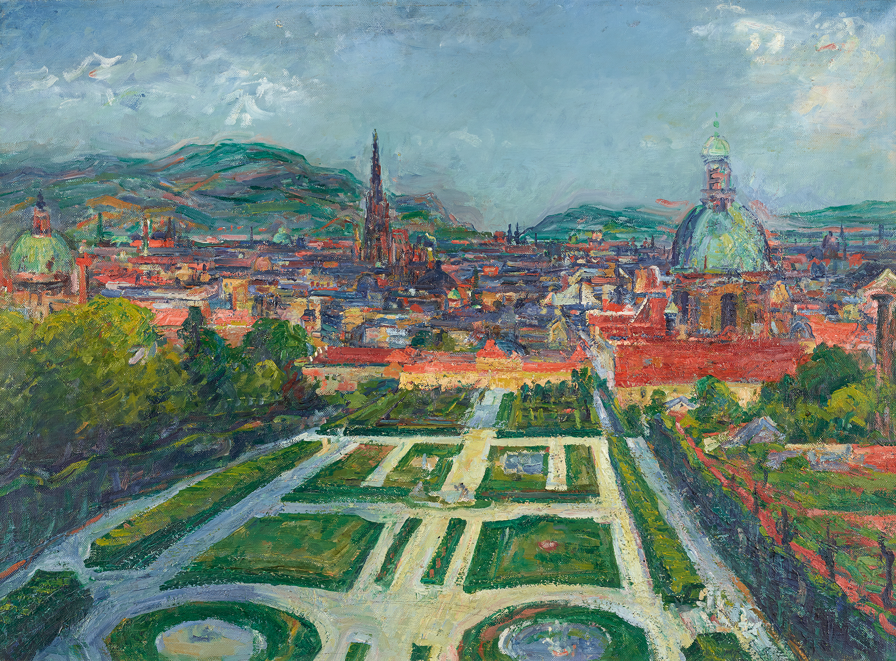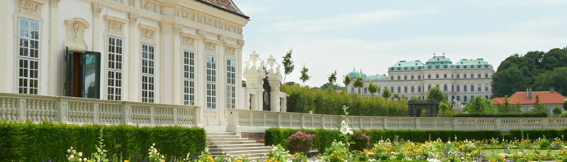 Palaces, mansions, and country estates with beautiful views were among the prestigious properties for the wealthy classes during the Baroque period—they were the luxury yachts of the eighteenth century. It was only fitting that Prince Eugene of Savoy chose to crown the gently sloping vineyard he had acquired south of Vienna in 1697 with a building from which he could take in the full sweep of the city below, stretching as far as Grinzing and the Kahlenberg—truly, a belv edere. A few decades later, the painter Canaletto would immortalize that very panorama.