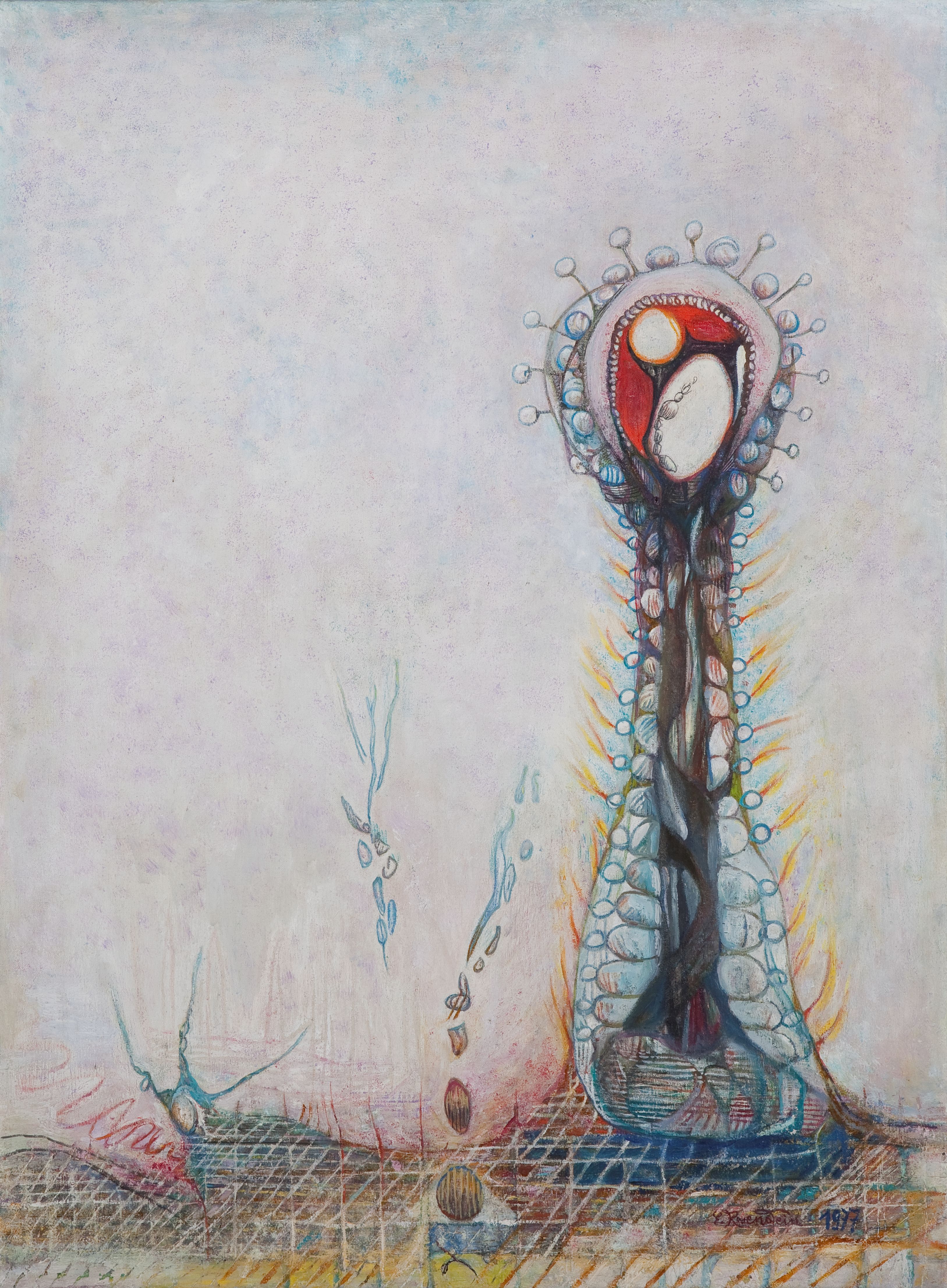 Erna Rosenstein, geboren 1913 in Lwiw in der heutigen Ukraine, schließt sich noch während der Schulzeit in Krakau der illegalen Internationalen Organisation zur Hilfe für Revolutionäre (MOPR) an. Durch das Studium an der Wiener Frauenakademie in den Jahren von 1932 bis 1934 soll sie, so das Ziel der Eltern, Abstand von ihrem politischen Engagement gewinnen. Rosenstein ist jedoch in Österreich sowie nach ihrer Rückkehr nach Polen, wo sie an der Akademie der bildenden Künste in Krakau studiert, weiterhin politisch aktiv. Während des Zweiten Weltkriegs und der Besetzung Polens sieht sich Rosensteins Familie als Jüdinnen und Juden nationalsozialistischer Verfolgung ausgesetzt. Auf der Flucht werden Rosensteins Eltern im Beisein der Künstlerin ermordet, sie selbst überlebt verletzt und verbringt die restlichen Kriegsjahre unter falschen Identitäten im Untergrund. In den Jahren 1947/48 bereist sie die Schweiz, England und Frankreich. In Paris besucht Rosenstein eine Reihe von surrealistischen Ausstellungen und lernt ihren zukünftigen Ehemann kennen, den Kritiker und Übersetzer Artur Sandauer, mit dem sie ab 1949 in Warschau lebt. Zu Beginn der 1950er-Jahre arbeitet Rosenstein fern vom öffentlichen Kunstbetrieb, nachdem sie Stellung gegen die Doktrin des sozialistischen Realismus bezogen hat und beharrlich an einer surrealistisch geprägten Bildsprache festhält. Im kommunistischen Polen der Nachkriegszeit ist Rosenstein erneut mit Wellen der Repression konfrontiert, die 1968 in einer staatlich gesteuerten antisemitischen Kampagne kulminieren. Dennoch entscheidet sich die Künstlerin zu keinem Zeitpunkt für den Bruch mit der Kommunistischen Partei oder das Exil, sondern avanciert zu einer der bedeutendsten Vertreter*innen der polnischen Nachkriegskunst. Als Gründungsmitglied der zweiten Krakauer Gruppe, der Künstler*innen wie Tadeusz Kantor, Maria Jarema oder Tadeusz Brzozowski angehören, nimmt Rosenstein an den maßgeblichen Ausstellungen für zeitgenössische Kunst in Polen sowie an Präsentationen polnischer Kunst im Ausland teil.