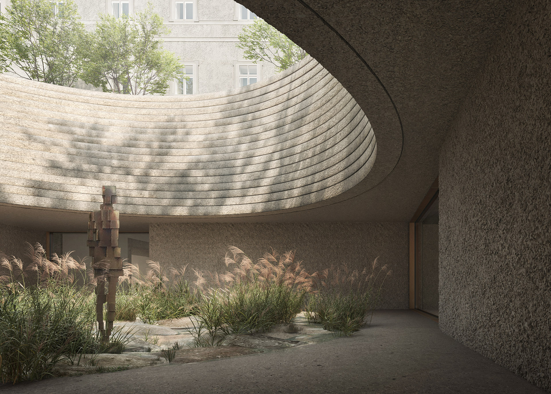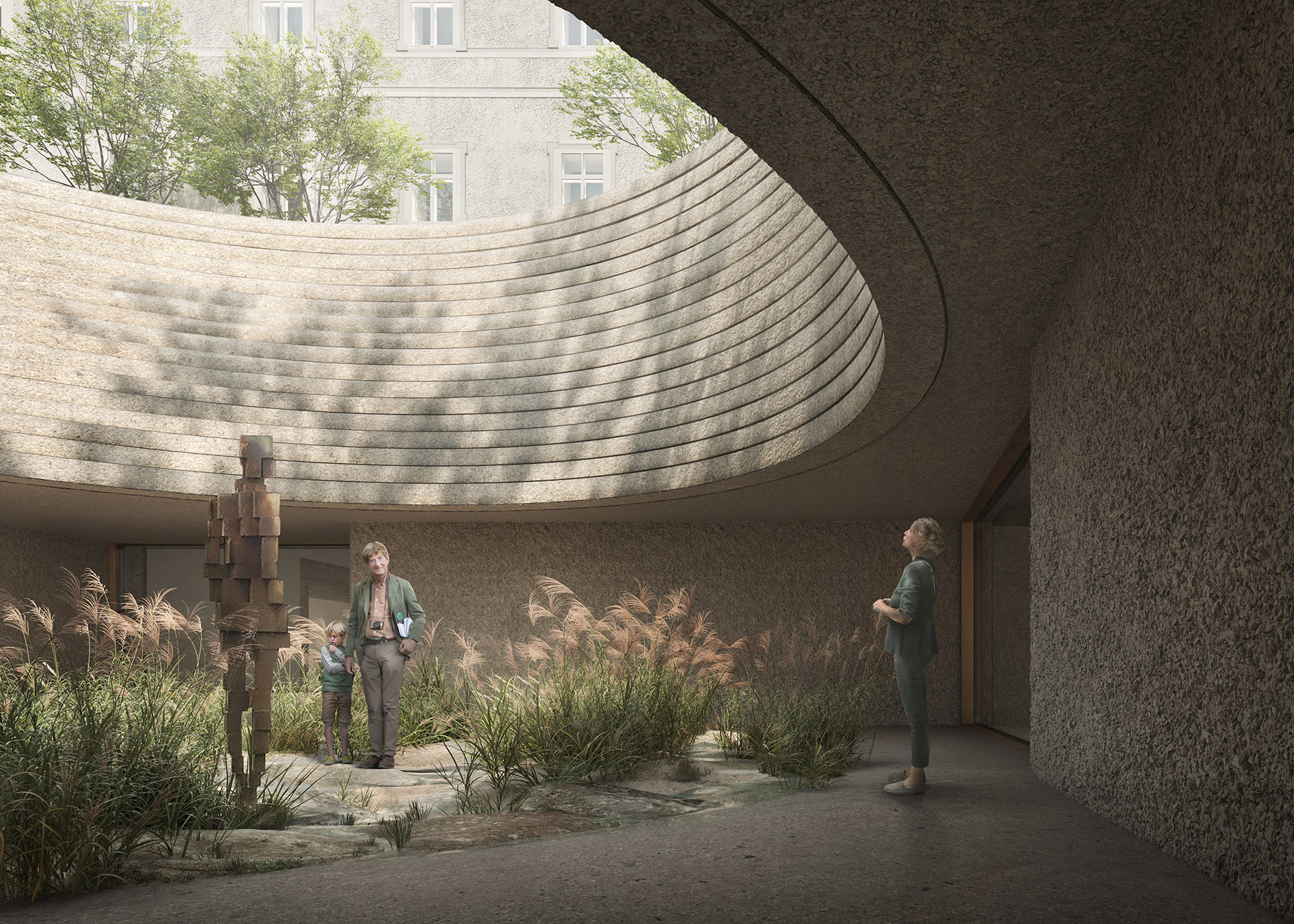 Ein Schlüsselmoment für ihn sei ein Blick auf den Nolli-Plan gewesen, erzählt Michael Salvi, Mitbegründer von Schenker Salvi Weber Architekten. Er habe angesichts des berühmten Stadtplans Roms aus dem 18. Jahrhundert, auf dem öffentliche Räume eingezeichnet sind, verstanden, dass auch Salzburgs Innenhöfen und Durchhäusern Sozialraum eingeschrieben ist. Mit dem Umbau des Hofs im Gebäudeensemble in einen kontemplativen „Gartenraum“ wünscht Salvi sich eine neue „grüne Mitte“ für Salzburg: Ein Spaziergang durch diesen „hortus conclusus“ könne auch den Auftakt für einen Weg durch die Museen der Altstadt bilden. Schon in der Spätrenaissance gab es hier eine wunderschöne Gartenanlage, weiß Eidos-Geschäftsführer Clemens Standl. Sein Büro forscht zu historischer Architektur und brachte das kulturgeschichtliche Wissen in Salvis Neubau-Expertise ein. Die Bauhistorie am Ort ist eng mit Fürsterzbischof Wolf Dietrich von Raitenau verwoben, der mit Baumeistern aus Italien einen der prunkvollsten Paläste des 17. Jahrhunderts schuf. „Wertschätzung für diese hochwertige Architektur“ ist Standl wichtig. Wenn die Architekten ihren Entwurf in den alten Bestand integrieren, werden sie freilich auf historische Elemente Bezug nehmen. Zum Beispiel mit einer neu interpretierten Sala terrena im Untergeschoss, einem fließenden Übergang zum mittigen Freiraum um den Lichtbrunnen. Als „Signature“-Element wird der Brunnen für Besucher*innen von überall zu sehen sein, wenn sie sich durch die Museumsräume im Untergeschoss bewegen .